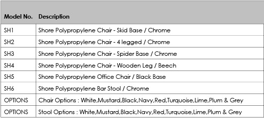 One of our Newest products the Shore is a Polypropylene. A durable chair available in nine different shell colours with an option of five different leg frames.